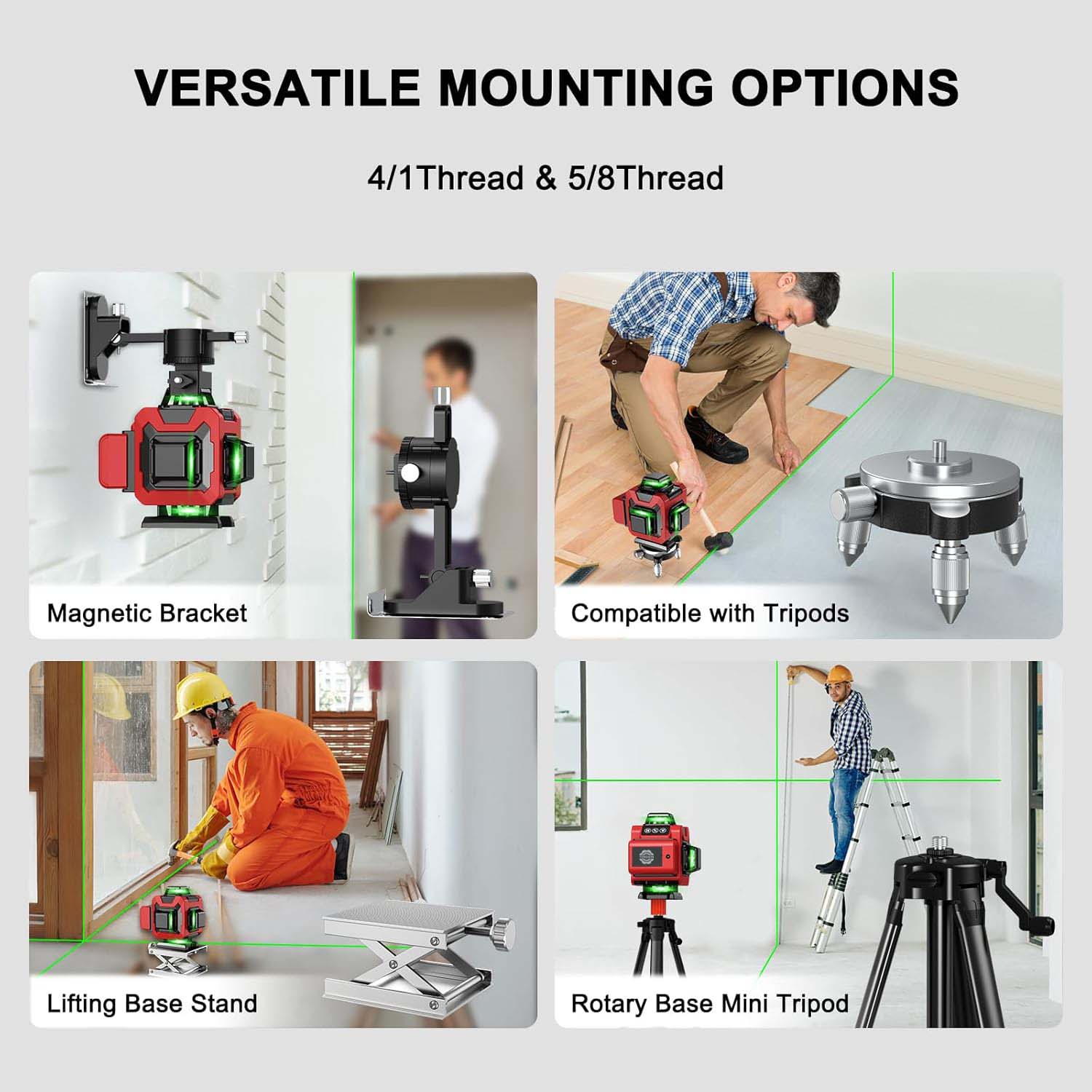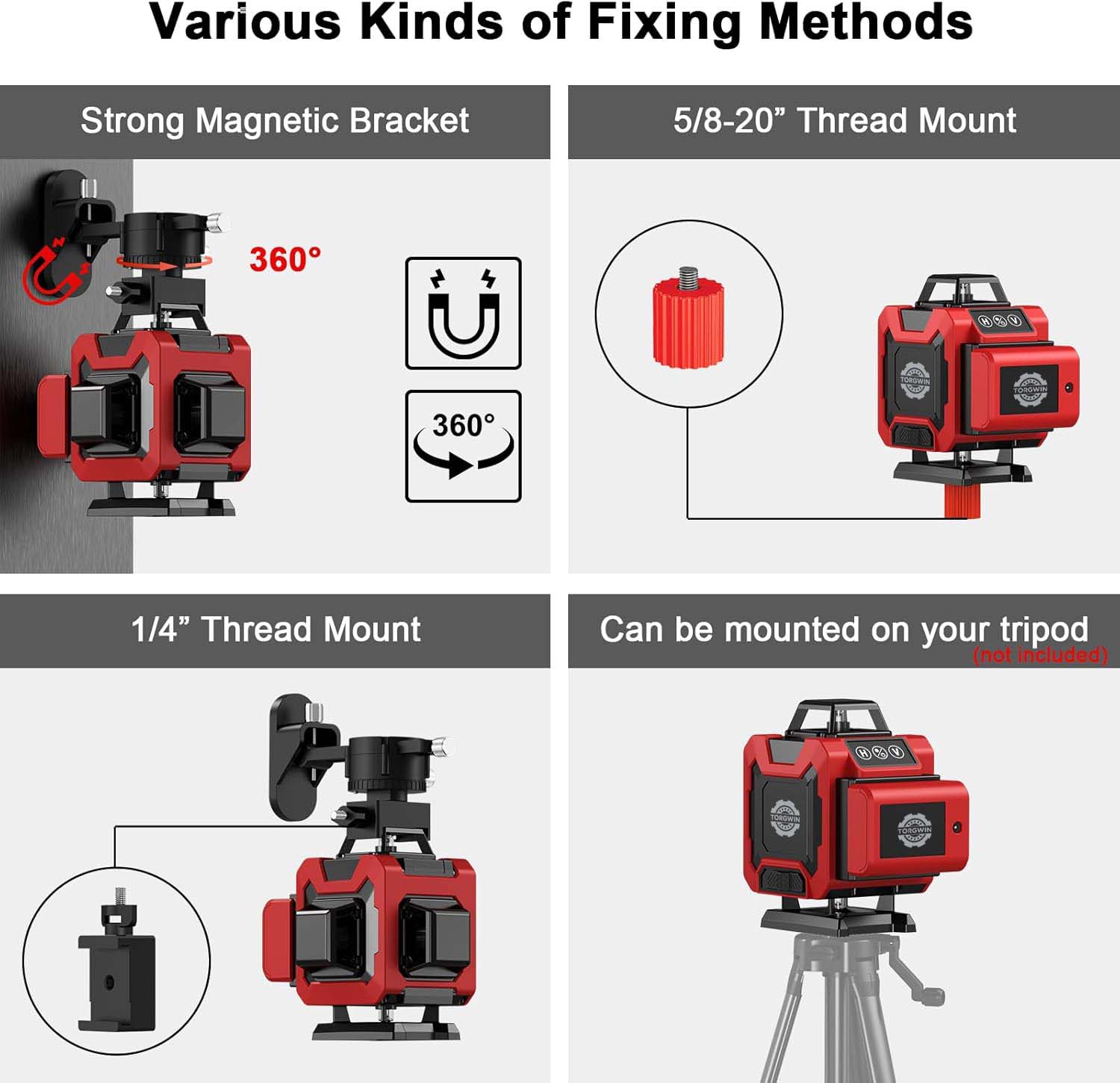 1. Kaedah penetapan yang pelbagai:Ia dilengkapi dengan pendakap magnet yang kuat, yang menyediakan cara yang stabil dan mudah untuk menetapkan tahap laser dalam banyak situasi. Gunung 5/8 - 20 "membolehkan sambungan ke peranti atau struktur tertentu dengan jenis benang ini.